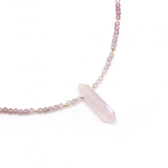 Koraliki kwarcu różowego płynnie przechodzą w odcienie ametystu (od różu do lawendy). Ta paleta kolorów wnosi wewnętrzną równowagę i jest idealnym talizmanem spokoju i kobiecości. Użycie drobnych, fasetowanych koralików na całej długości maksymalizuje blask naszyjnika. Akcenty złoconego hematytu i zapięcie ze złoconej stali szlachetnej gwarantują wyrafinowane i trwałe wykończenie. Połączenie mocnej, pionowej formy szpica z eterycznym, gradientowym sznurem kamieni tworzy projekt, który wyróżnia się artystyczną wizją. Malena to biżuteria dla osoby o romantycznej, ale zdecydowanej osobowości.