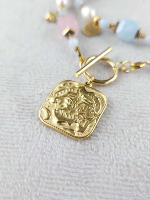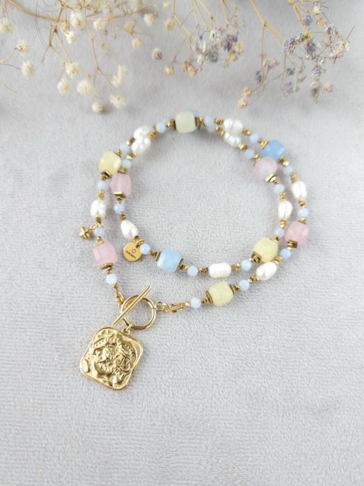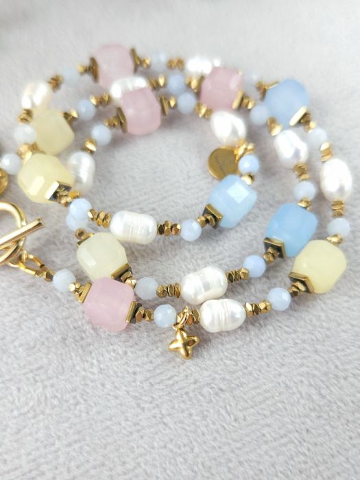 Naszyjnik z morganitu, pereł, akwamarynu, hematytu i stali