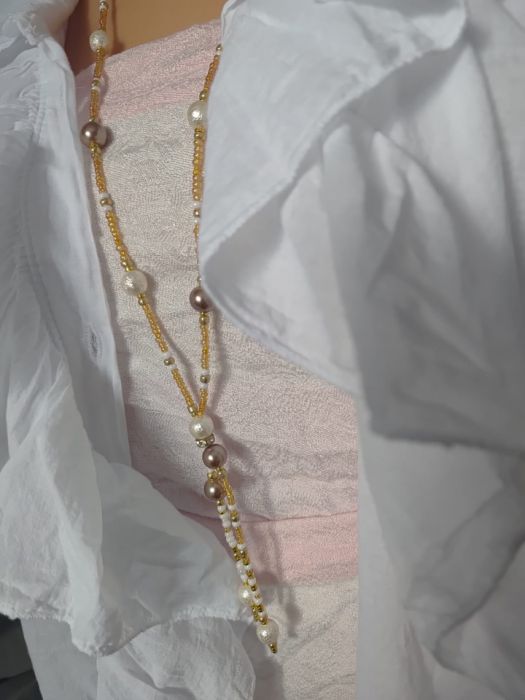 Naszyjnik z pereł szklanych dużych, gniecionych, białych, z najlepszego czeskiego szkła i i innych w kolorze beżowym. Inne koraliki to szkło w kolorze zlotym i białym perłowym, drobne 3 mm Naszyjnik dlugi, wygodnie zakładany przez głowę bez zapięcia. Wykończone jest chwościkiem i malutka przekładką ze szklanymi cyrkoniami.