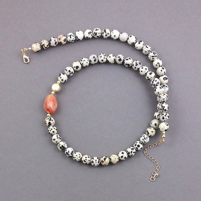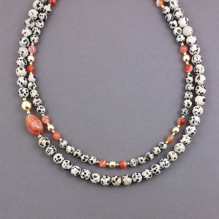 Pierwszy, dłuższy wykonany jest z gładkich kul, modnego jaspisu dalmatyńskiego, kuli złotego hematytu i nieregularnej bryłki agatu w pięknym łososiowo pomarańczowym kolorze. Kamienie mają średnicę 8mm. Długość naszyjnika-ok.52cm plus 5cm przedłużki.