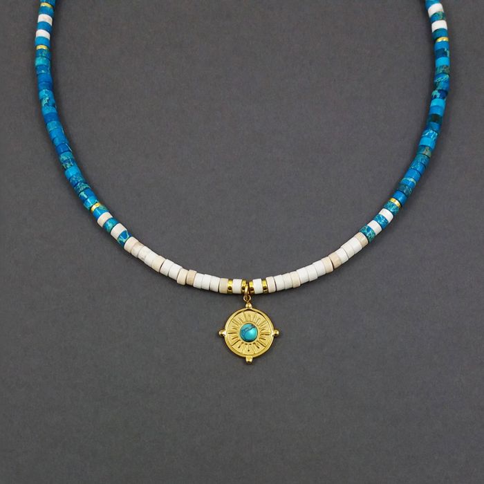 Efektowny, krótki naszyjnik z krążków turkusowego jaspisu, howlitu w kolorze kości słoniowej i złotego hematytu. Kamienie mają średnicę 4 mm.