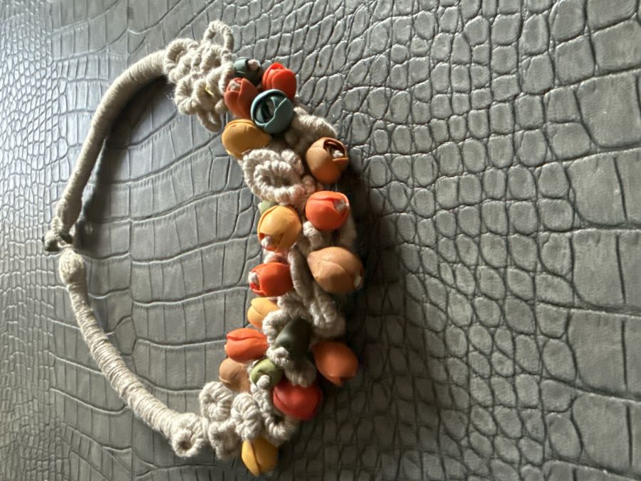 Unikatowy naszyjnik wykonany z liny w oplocie z lny oraz przy udziale ręcznie wykonanych elementów z glinki polimerowej. Kwiaty wykonane ręcznie.