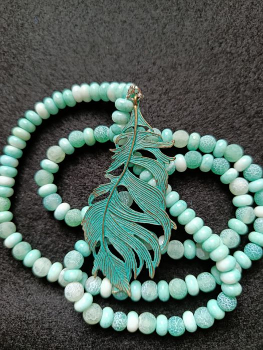 Naszyjnik długości 80 cm został wykonany z agatów w kształcie kuli i oponek o średnicy 8 mm. Kolorystyka utrzymuje się w barwach mięty, seledynu i bieli. Kamienie nawleczone są na linkę stalową z uwagi na ciężkość kamieni. Metalową zawieszkę stanowi patynowane piórko o wymiarach 8 x 4 cm.