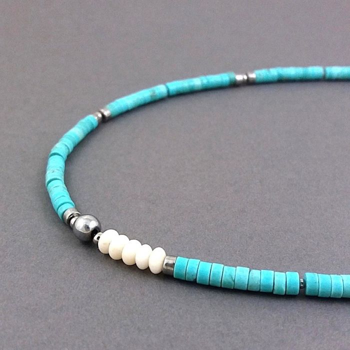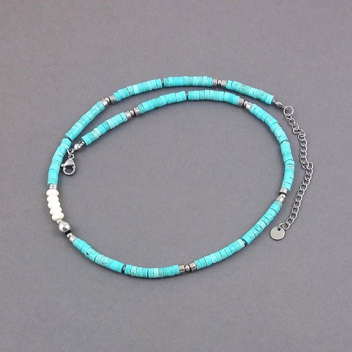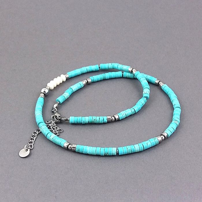 Krótki, asymetryczny naszyjnik z krążków naturalnego (niedoskonałego), turkusowego howlitu.