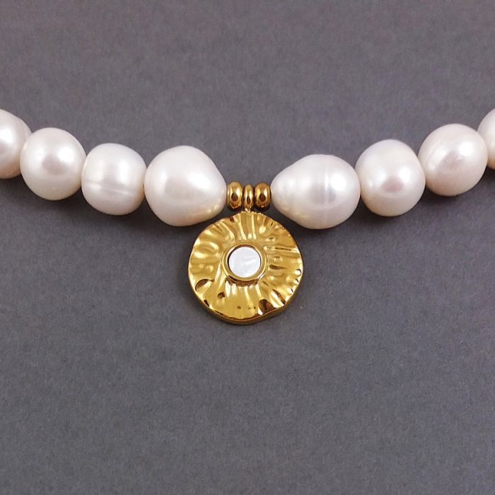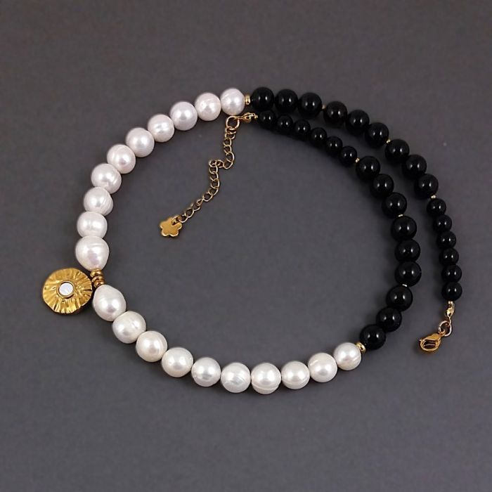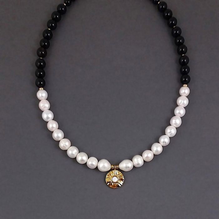 Okazały, elegancki naszyjnik w modnej wielkości XL, z białych pereł hodowlanych i gładkich kulek czarnego onyksu. Kamienie mają średnicę 8-9mm. Centralnie umieściłam piękną zawieszkę z nieuczulającej, pozłacanej stali szlachetnej, z oczkiem z masy perłowej. Zawieszka ma średnicę 15mm.