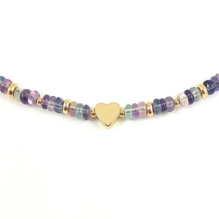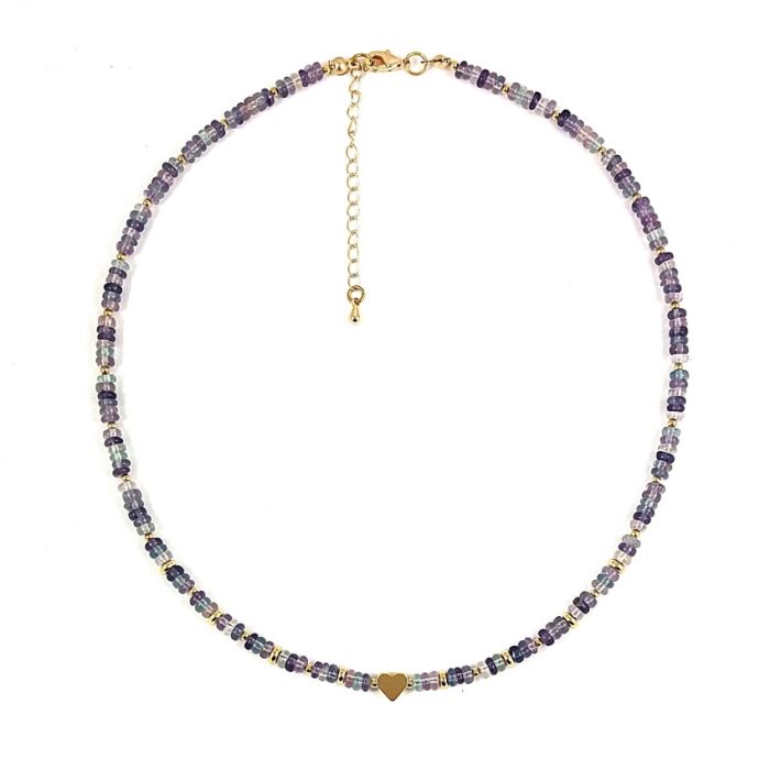 Krótki, delikatny naszyjnik z krążków fluorytów, w pięknych kolorach: fioletu, zieleni, granatu, delikatnego różu. Kamienie mają średnicę 4mm. Przekładki- kuleczki i oponki, a także serduszko i zapięcie wykonane są z nieuczulającego, pozłacanego mosiądzu (gold filled-metoda złocenia, znacznie trwalsza niż złocenie np. srebra).