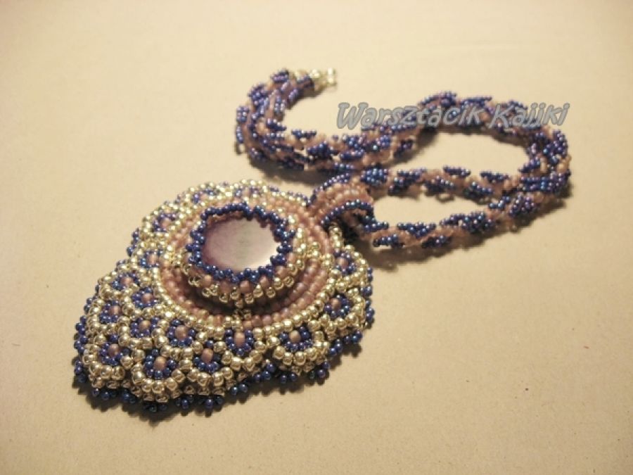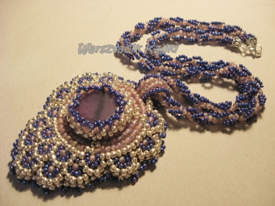 Wisior naszyjnika został wykonany techniką haftu koralikowego. Jego centrum stanowi okrągła moneta agatu-pająka. Wisior zawieszony jest na sznurze plecionym z drobnych szklanych koralików toho. Spód podszyty jest cienkim filcem. Wymiary wisiora to 7cm na 7cm. Długość sznura to ok 50 cm, zapięcie: karabińczyk.