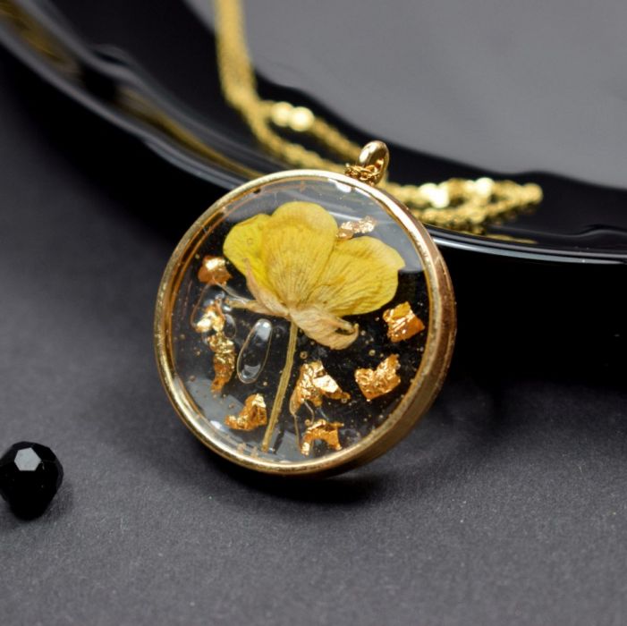 Unikatowy naszyjnik wykonany ręcznie z transparentnej żywicy, w której został zatopiony drobny, żółty kwiat zerwany na łące oraz delikatne płatki złota. Naturalna kompozycja przywołuje na myśl ciepłe promienie słońca i letnią beztroskę.