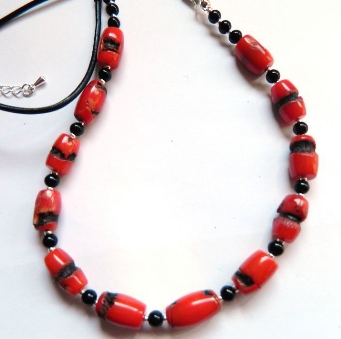 Naszyjnik stanowią wałeczki korala robaczywki oraz kuleczki czarnego onyksu.
