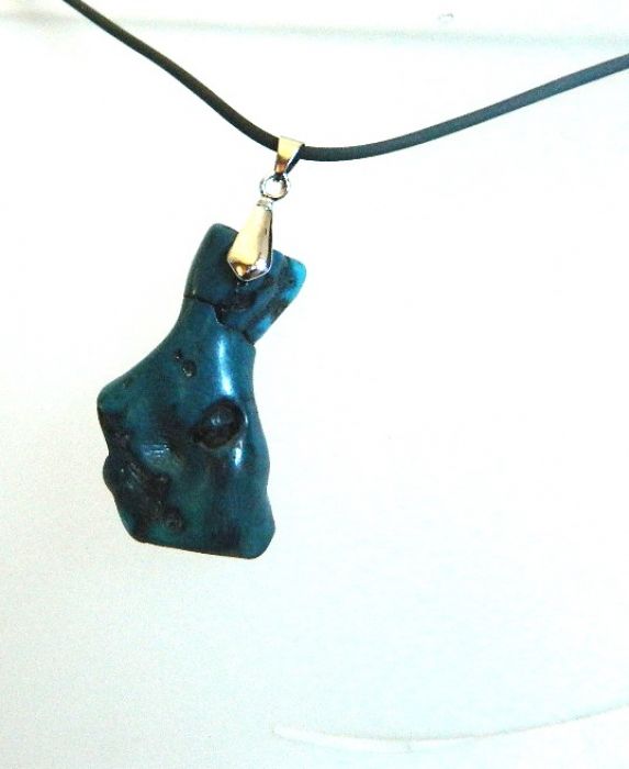 Zawieszony na czarnym kauczukowym rzemieniu.
