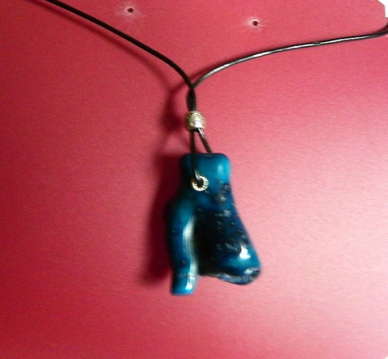 Zawieszony na skórzanym rzemieniu.
