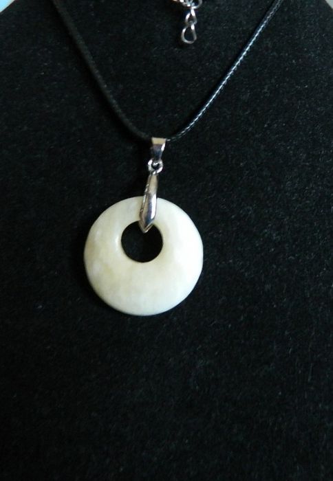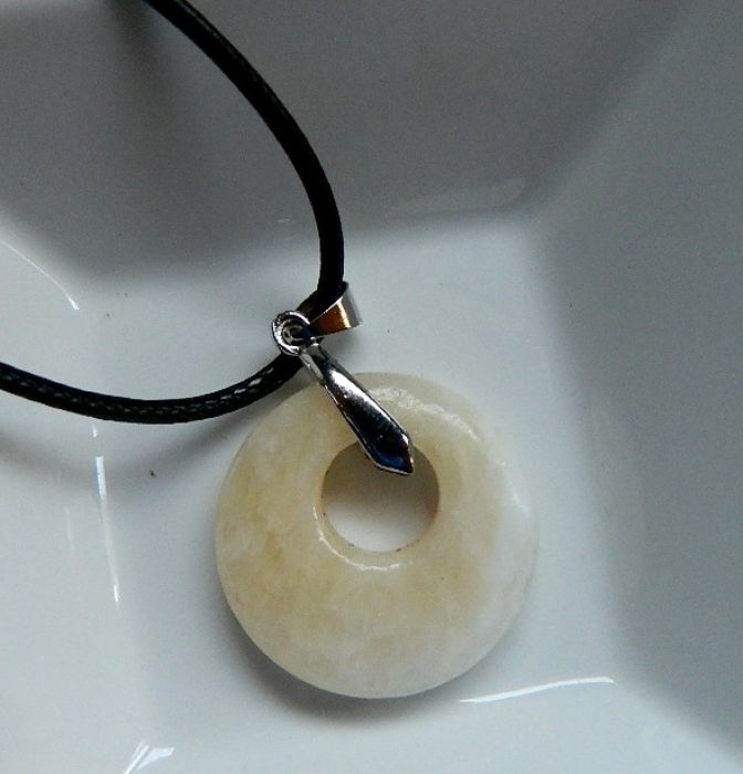 Wisiorek ma kształt koła, z niesymetrycznie położoną dziurką. Jest naturalny, więc posiada właściwe dla minerałów nierówności i delikatne druzy.
