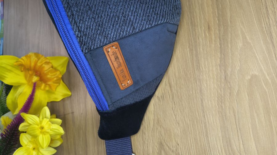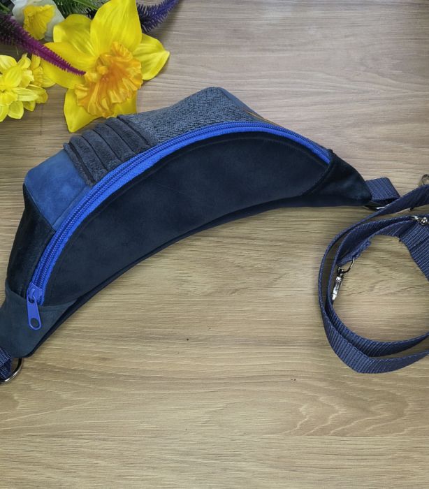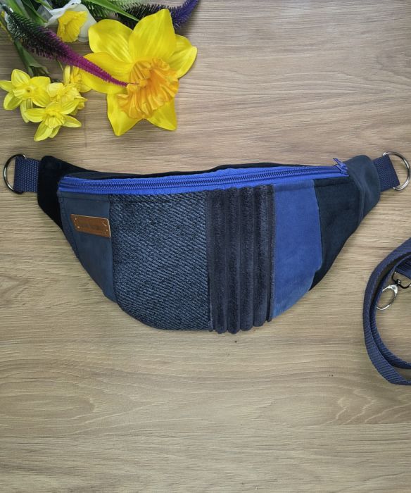 Granatowa nerka patchworkowa uszyta ręcznie z trwałych tkanin tapicerskich o różnych fakturach. Klasyczny kolor przełamany strukturą materiałów – pasuje do stylizacji sportowych i codziennych.