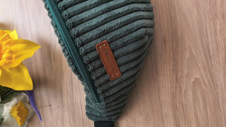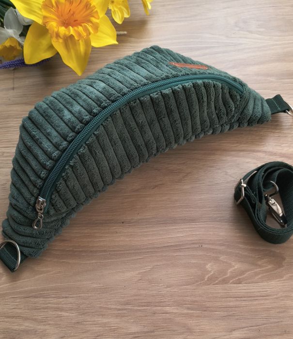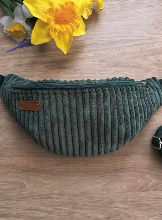 Stylowa nerka uszyta ręcznie z miękkiego sztruksu tapicerskiego w modnym, głębokim odcieniu zieleni. Materiał ma wyraźną strukturę, dzięki czemu nerka wygląda bardzo oryginalnie i przyciąga uwagę.