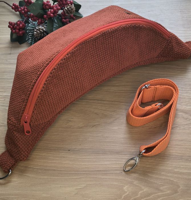 Uszyta z grubej, mięsistej tkaniny tapicerskiej o pięknej strukturze. Jest solidna, trzyma formę i świetnie się nosi – zarówno na biodrach, jak i przez ramię.