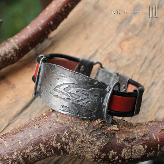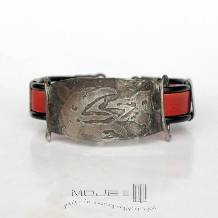 Bransoleta z trawionym w miedzianej blasze motywem stylizowanych ptaków. Miedź jest pokryta cyną, patynowana i przecierana. Wykończona jest skórzanymi rzemieniami - płaskim w kolorze koniakowym i okrągłymi w kolorze czarnym.