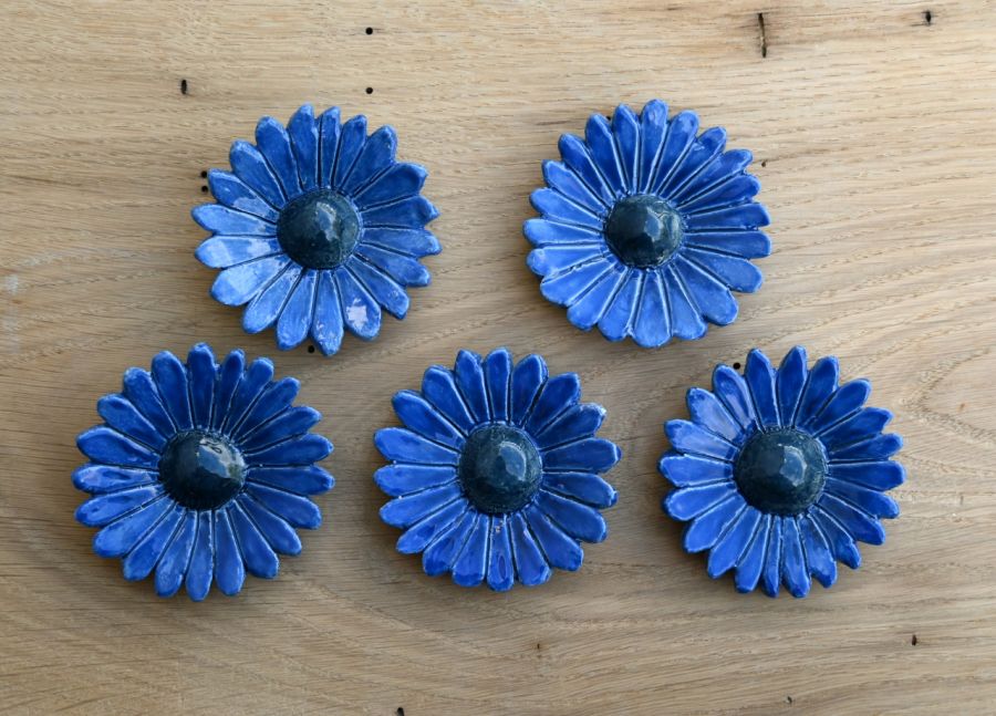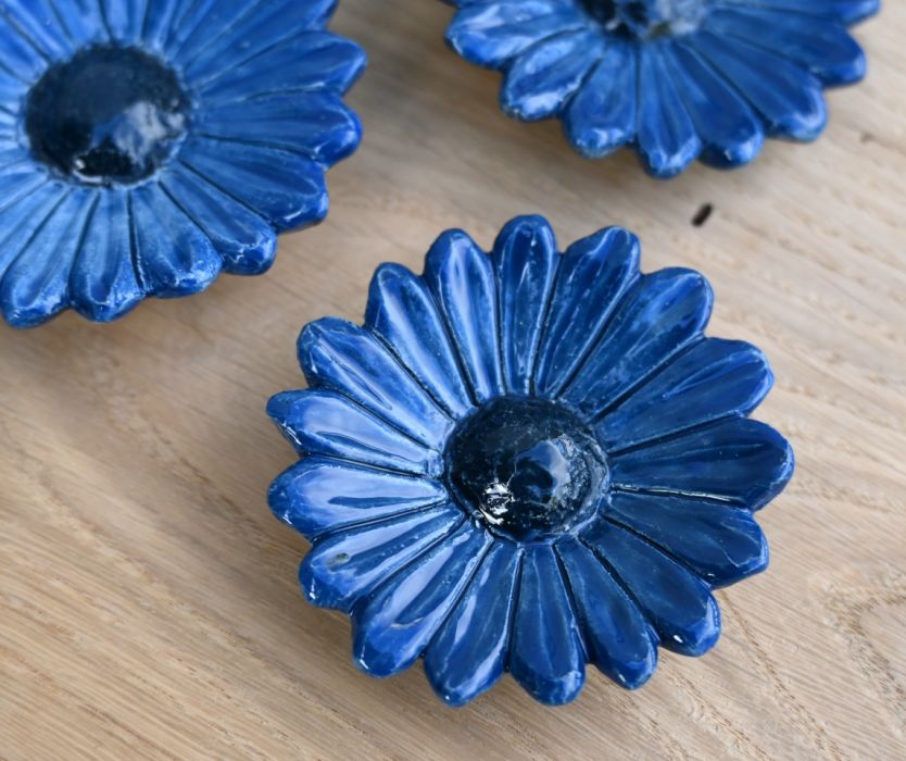 Ceramiczny niebieski kwiatek typu margaretka, ręcznie lepiony, przed wysyłką montowany na metalowym drucie florystycznym i średnicy 1,8 mm, dzięki temu można dostosować długość łodygi (standardowo 40 cm) i wygięcia. Pięknie prezentuje się w większym bukiecie.