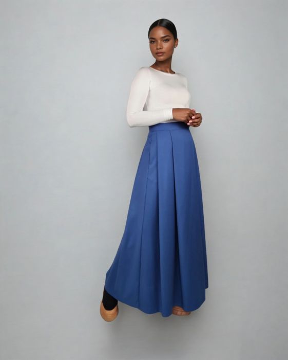 Zadaj pytanie dotyczące produktu: Niebieska spódnica maxi z ozdobnymi kontrafałdami.