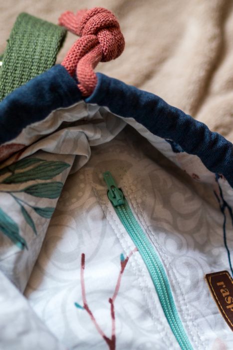 Ściągana jest jak worek bawełnianym sznurkiem w kolorze kwiatowym. Dół daje dodatkowe miejsce na przechowywanie rzeczy - z przodu dwie mniejsze, z tyłu torby jedna duża kieszeń.