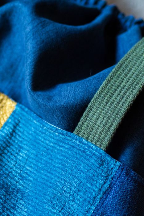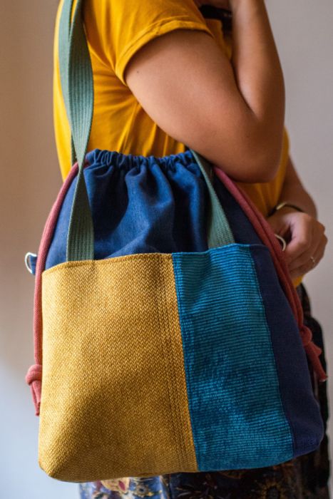 Torba worek wykonana z kilku rodzajów tkanin. Stworzona w duchu no waste.