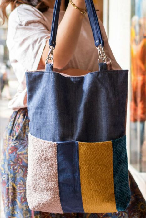 Duża torba na ramię wykonana z niebieskiego jeansu oraz pudroworóżowej plecionki.
