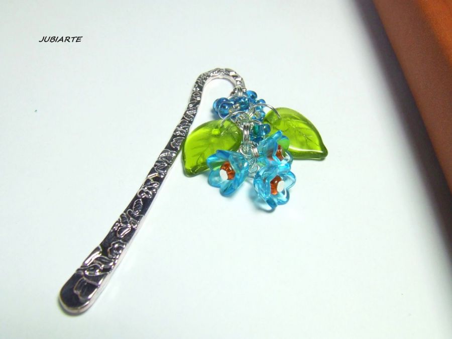 Efektowna zakładka do książki wykonana z metalowej, grawerowanej bazy w kolorze srebra, koralików z akrylu w kształcie kwiatków, szklanych listków Jablonex, koralików TOHO oraz srebrzonych kółeczek.