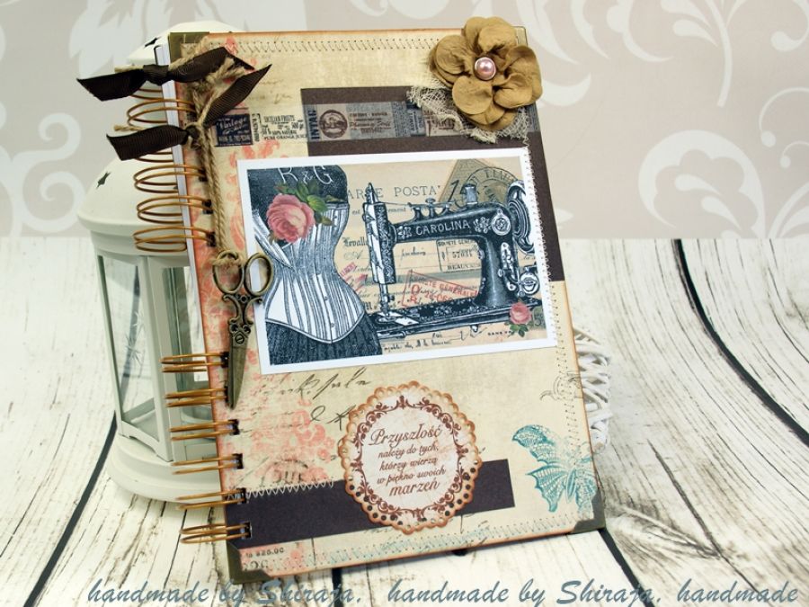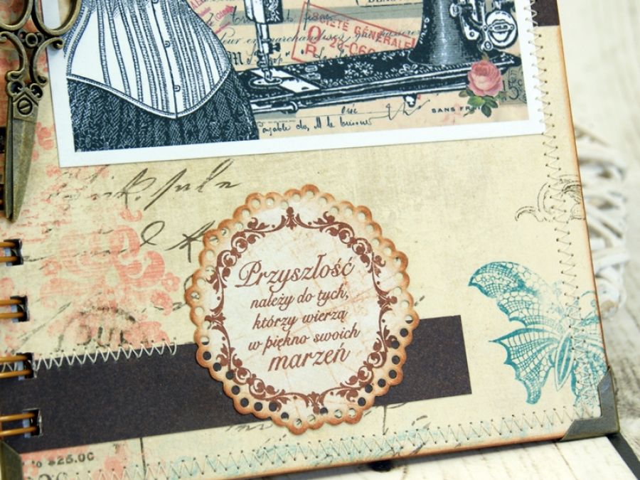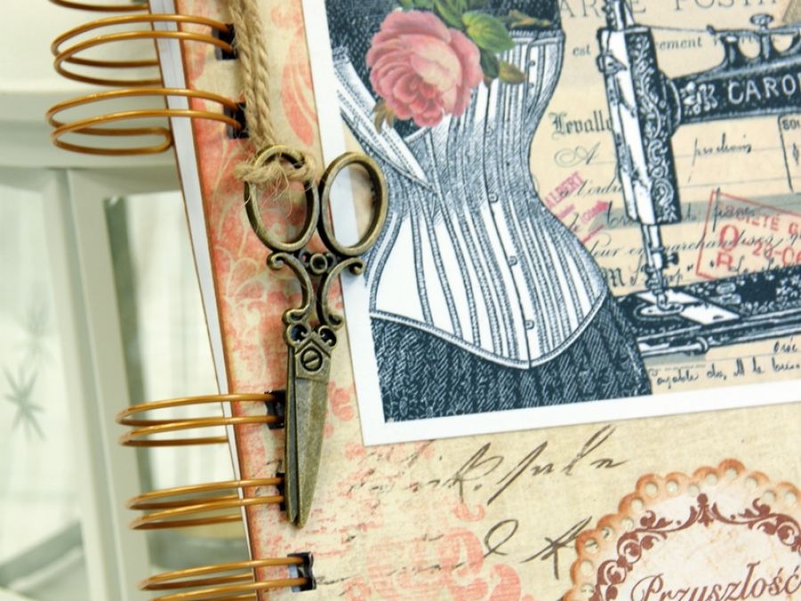 Wykonany w technice scrapbookingu, obszywany maszynowo. Grafika , zawieszka -nożyczki, oraz zakładka. Kartki w kratkę ok. 100szt.