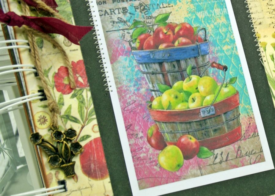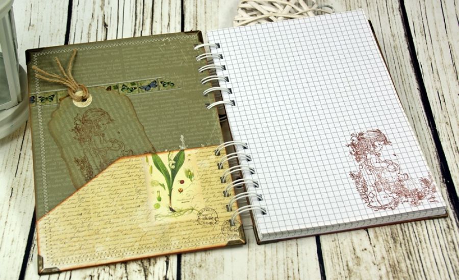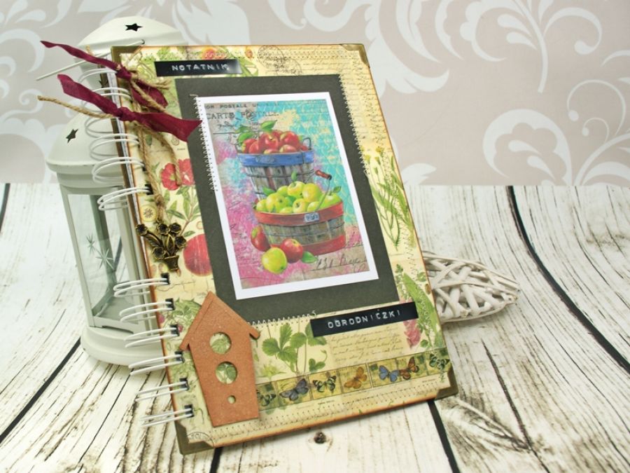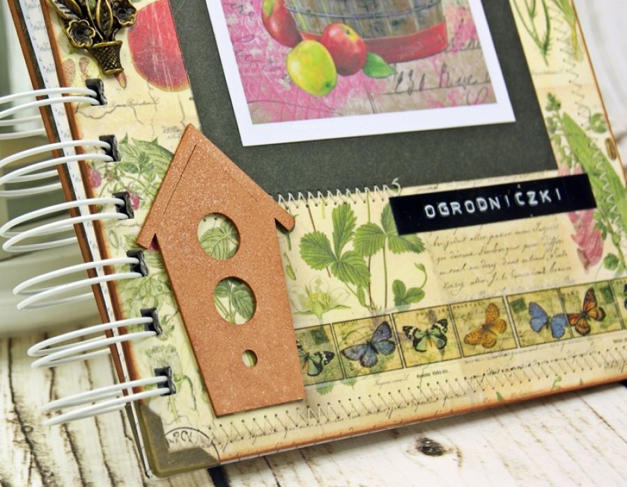 Wykonany w technice scrapbookingu, obszywany maszynowo. Urocza grafika, zawieszka, oraz zakładka. Kartki w kratkę oraz czyste (np na szkice ogrodu)
