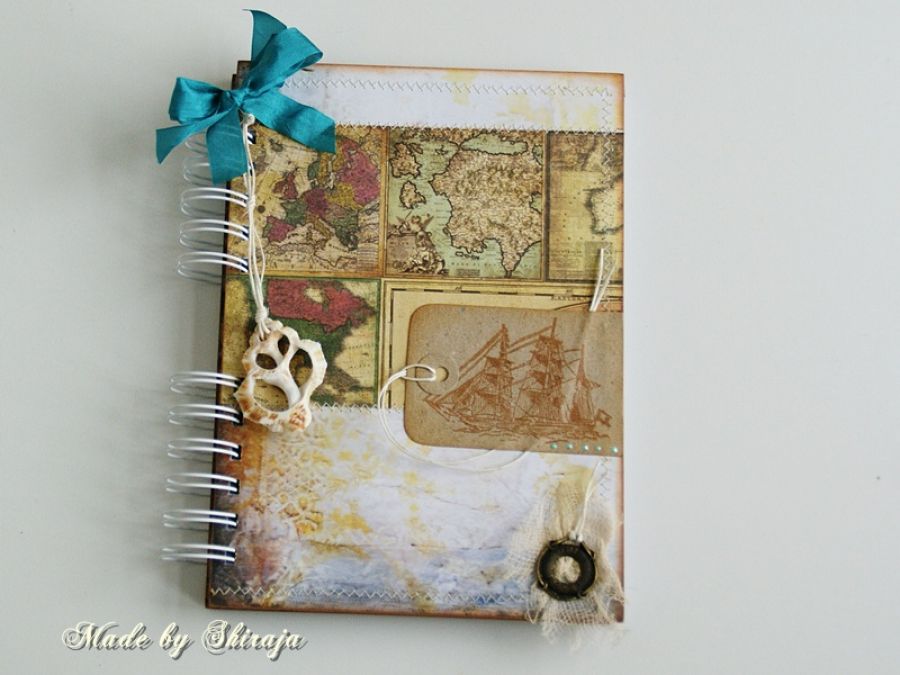 Wyjątkowy notes na zapiski z podróży, wykonany własnoręcznie. Ozdobiony wysokiej jakości papierami do scrapbookingu obszytymi maszynowo. Uroku dodają ażurowa muszelka . W środku ok 100szt kartek w kratkę. Dekoracyjnie zapakowany w przezroczystą folię, będzie idealnym prezentem.