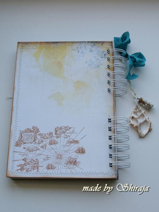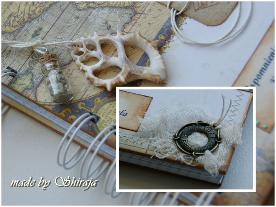 Wyjątkowy notes na zapiski z podróży, wykonany własnoręcznie. Ozdobiony wysokiej jakości papierami do scrapbookingu obszytymi maszynowo. Uroku dodają ażurowa muszelka oraz zawieszka -słoiczek wypełniony piaskiem. W środku ok 100szt kartek w kratkę. Dekoracyjnie zapakowany w przezroczystą folię, będzie idealnym prezentem.