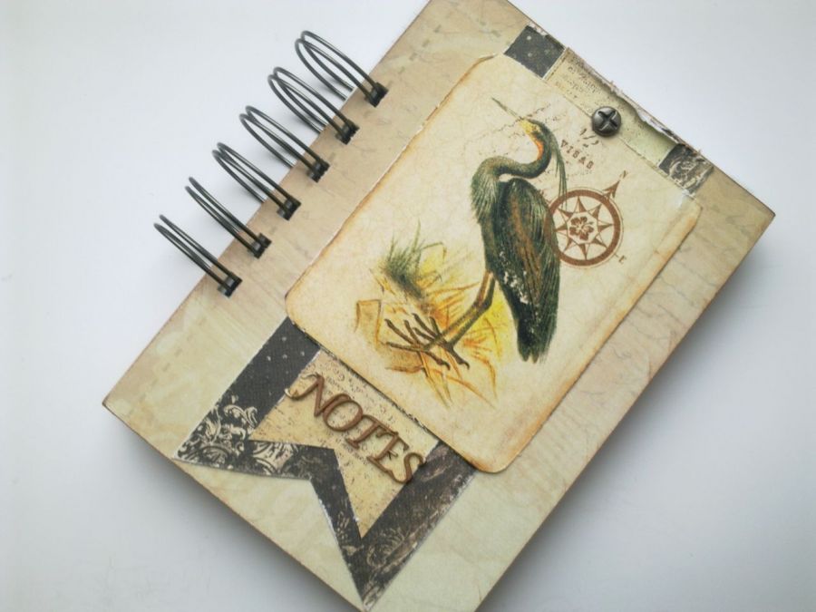 Klimatyczny notesik A6, wykonany z papierów scrapbookingowych nakładanych warstwowo, potuszowany i poszarpany na brzegach, udający stary. Twarde okładki. Dodany jest dekoracyjny ćwiek i naklejony jest" notes". Po wewnętrznej stronie twardej okładki - kieszonka na wizytówki lub małe karteczki. W środku 100 kartek w kratkę.