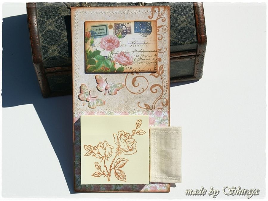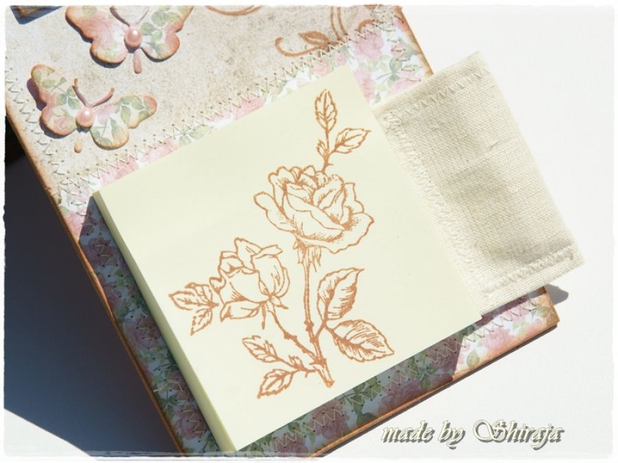 Wyjątkowy notes na lodówkę wykonany z wysokiej jakości papierów do scrapbookingu, obszywany maszynowo. Ozdobiony obrazkiem z motywem kwiatów róży. Kieszonka na długopis wykonana z materiału. Karteczki na zapiski można wymieniać samemu. Z tyłu przymocowany magnes.