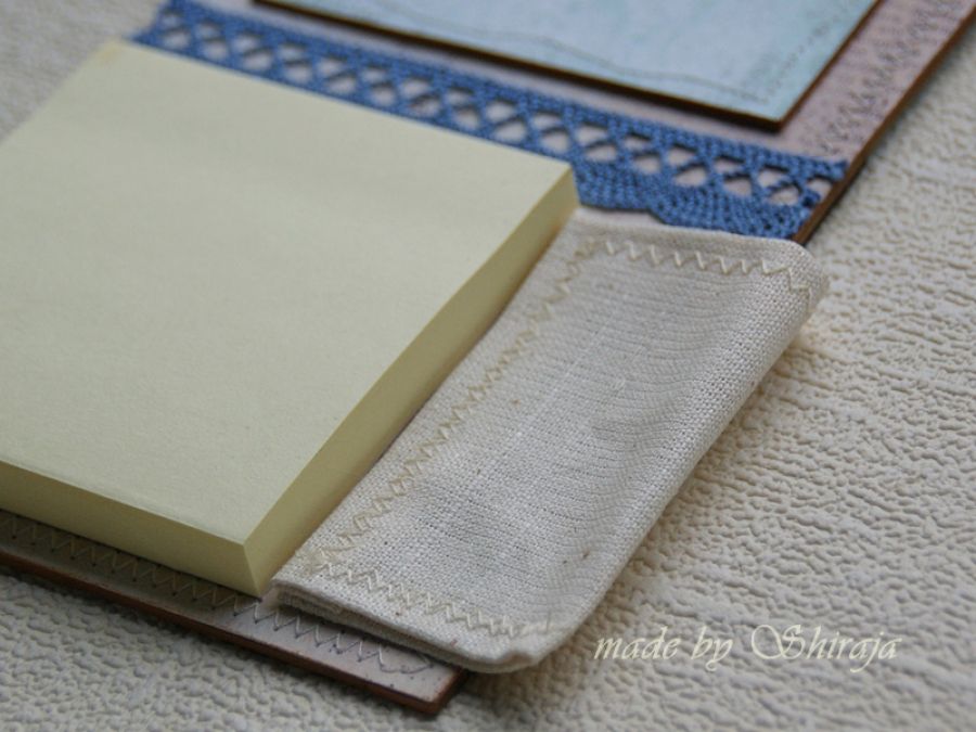 Wyjątkowy notes na lodówkę wykonany z wysokiej jakości papierów do scrapbookingu, obszywany maszynowo. Ozdobiony obrazkiem z motywem roślinnym, oraz ażurową wstążką.