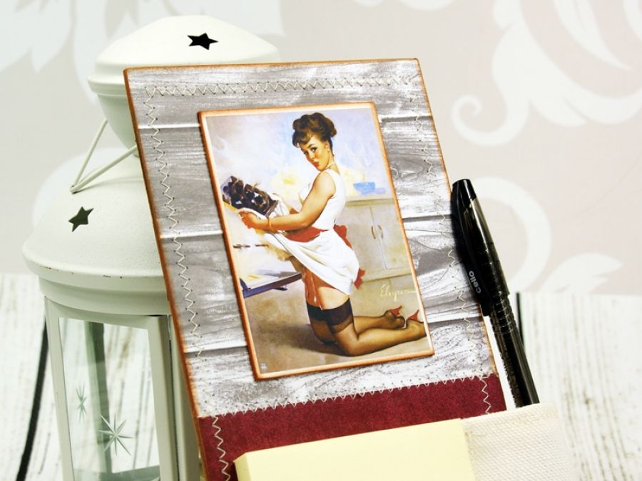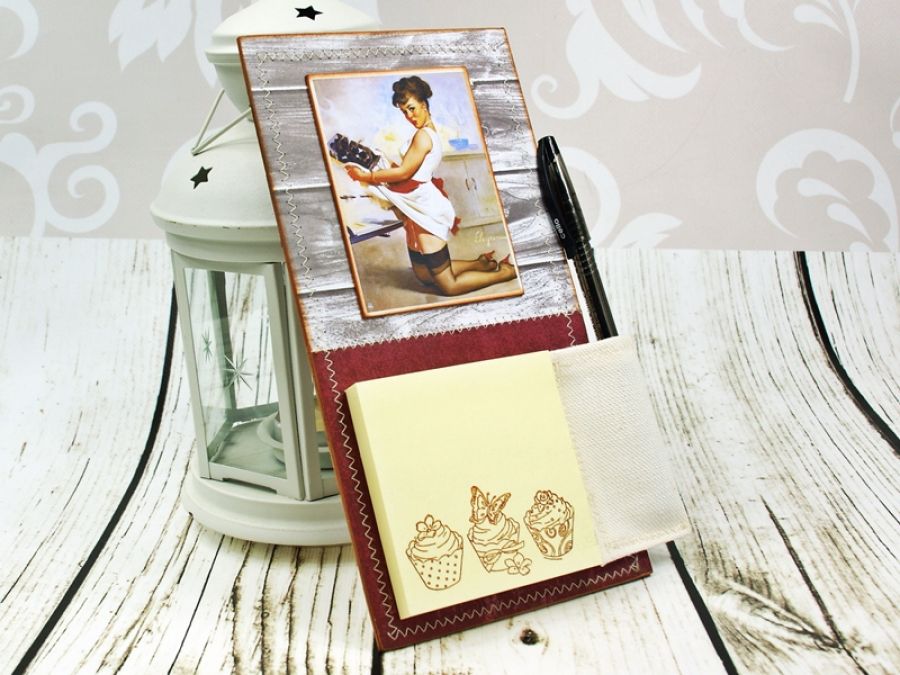 Wyjątkowy notes na lodówkę wykonany z wysokiej jakości papierów do scrapbookingu, obszywany maszynowo. Ozdobiony grafiką z pin up girl. Kieszonka na długopis wykonana z materiału. Karteczki na zapiski można wymieniać samemu. Z tyłu przymocowany magnes.