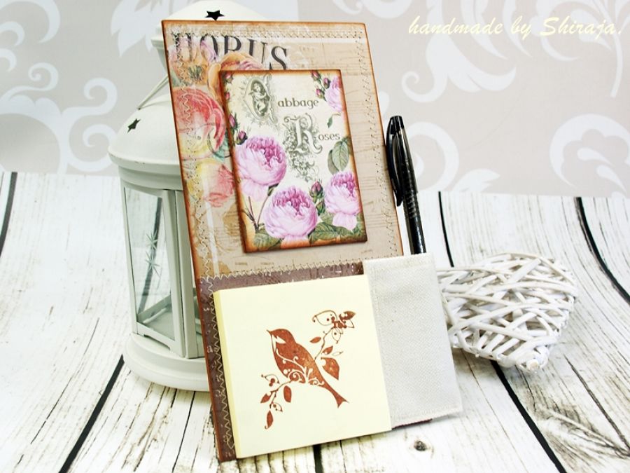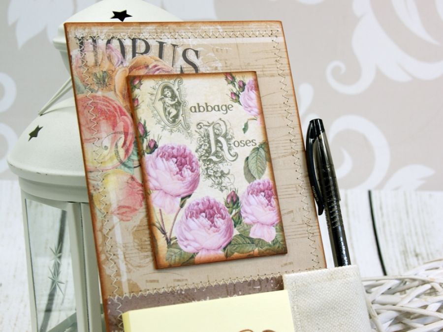 Wyjątkowy notes na lodówkę wykonany z wysokiej jakości papierów do scrapbookingu, obszywany maszynowo. Ozdobiony obrazkiem z motywem róż. Kieszonka na długopis wykonana z materiału. Karteczki na zapiski można wymieniać samemu. Z tyłu przymocowany magnes.