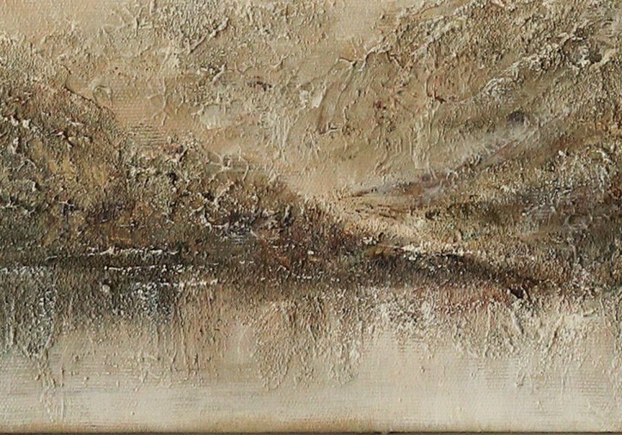 Obraz namalowany farbami akrylowymi na bawełnianym podobraziu (boku również zamalowane), z użyciem pasty/masy strukturalnej. Całość zabezpieczona werniksem.