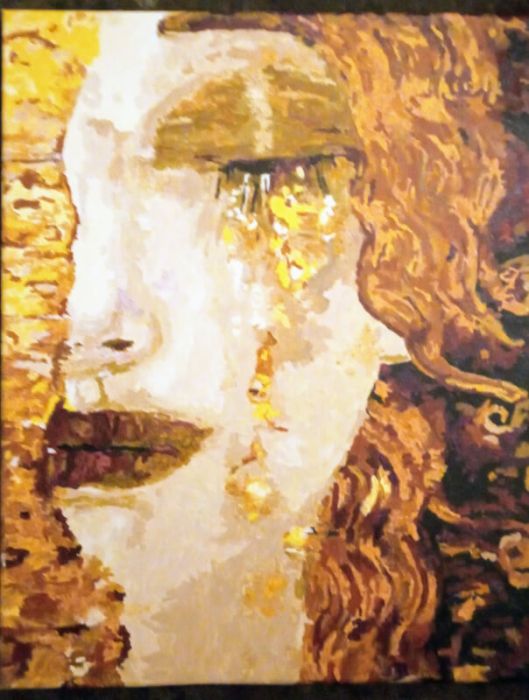 Nastrojowy, symboliczny portret inspirowany złotym okresem Gustava Klimta. Obraz przedstawia kobiecą twarz – fragmentaryczną, jakby wyłaniającą się z tła – z łzą ze złota spływającą po policzku. Ciepłe, miodowe brązy, rozświetlone akcentami złocistych refleksów, tworzą niezwykłą atmosferę intymności, melancholii i piękna. To dzieło pełne emocji, balansujące między siłą a delikatnością.