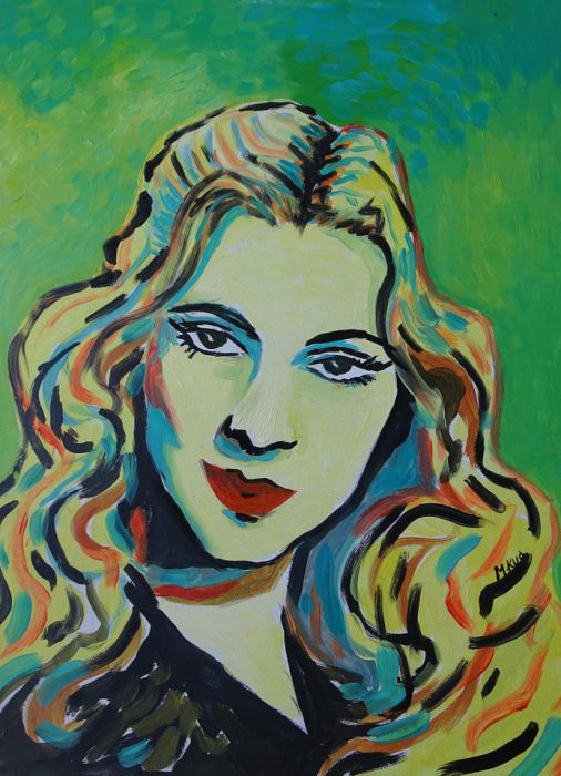 Obraz emanuje żywymi kolorami i dynamicznymi kształtami, które przyciągają wzrok. Tło ma intensywnie zielony kolor, przypominający wiosenne łąki, co tworzy kontrast dla twarzy kobiety namalowanej w centrum. Jasne tony jej cery łączą się z odcieniami błękitu i pomarańczy, dodając twarzy pewnego rodzaju tajemniczości. Czarna linia obrysowuje wyraziste oczy i pełne usta, tworząc dramatyzm i głębię. Kompozycja jest prosta, ale pełna energii, jakby artystę inspirowała radość i lekkość chwili. Styl obrazu przypomina techniki postimpresjonizmu, gdzie emocje są ważniejsze niż rzeczywistość. Oglądając go, można poczuć ciepło i nostalgiczny spokój, jakby wpatrywało się w słoneczny dzień. A może to tylko ja i moja wyobraźnia. Technika użyta tutaj wydaje sie być mieszanką agresywnych pociągnięć pędzla, co dodaje dynamiki. "Patrz! Ma kolory tęczy na włosach!" Obraz wywołuje uśmiech i zachwyt, jednocześnie skłaniając do zatrzymania się na chwilę i podziwiania tej kolorowej symfonii barw i emocji. Artystyczny wyraz - stunning! - sprawia, że na długo pozostaje w pamięci.