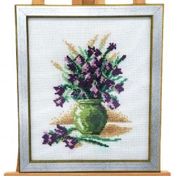 Unikalna dekoracja ścienna wykonana metodą haftu krzyżykowego, przedstawiająca bukiet fioletowych kwiatów w zielonym wazonie. Rękodzieło cechuje się wysoką precyzją i estetyką wykonania – doskonale sprawdzi się jako ozdoba wnętrza, prezent lub element kolekcji.