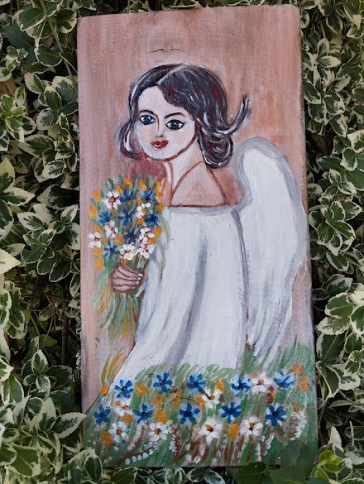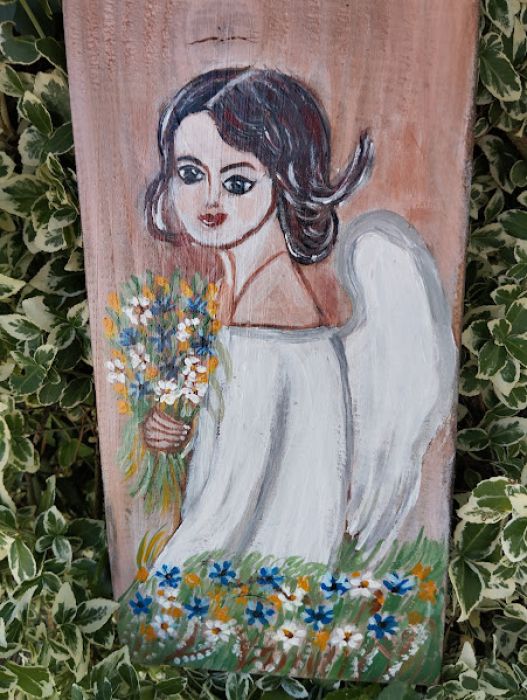 Obraz anioła malowany na desce farbami akrylowymi .Wielkość 16x30 cm Z tyłu jest zawieszka Całość zabezpieczona werniksem. To doskonały prezent dla dziewczynki, zatytułowałam Lato - ze względu na otaczające kwiaty