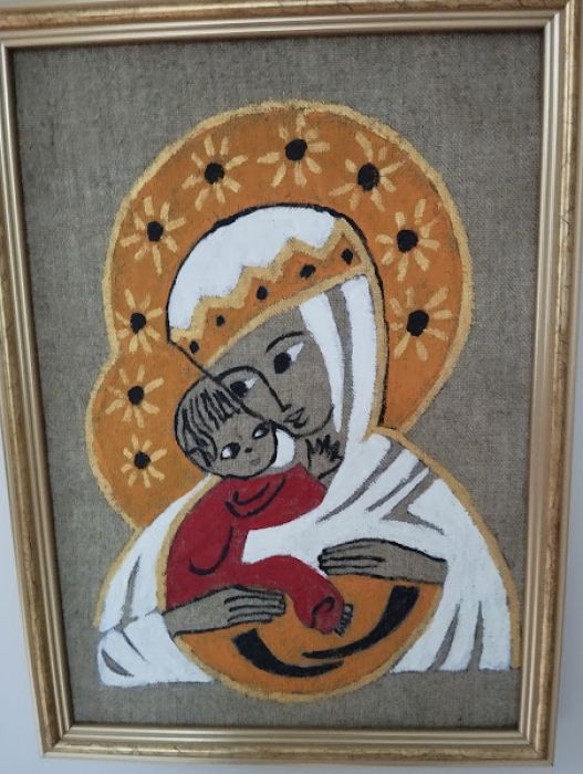 obraz malowany na tkaninie lnianej ;Matka Boża z Dzieciątkiem stylizowany w sposób charakterystyczny dla ikonografii