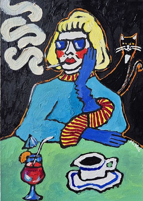 Na ciemnym, niemal nocnym tle wyłania się postać kobiety o jasnych, żółtawych włosach i twarzy zbudowanej z kontrastów: bladej bieli, intensywnej czerwieni policzków i ust oraz chłodnego błękitu okularów. Jej spojrzenie jest ukryte, odgrodzone szkłem – jakby była obecna, ale jednocześnie zdystansowana. Papieros w ustach i unoszący się obok miękki, falujący dym nadają scenie leniwy, lekko dekadencki rytm.