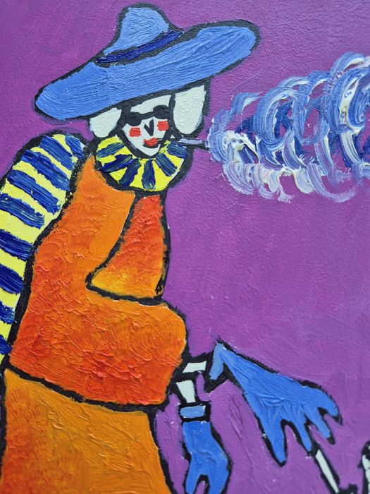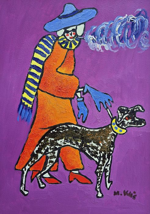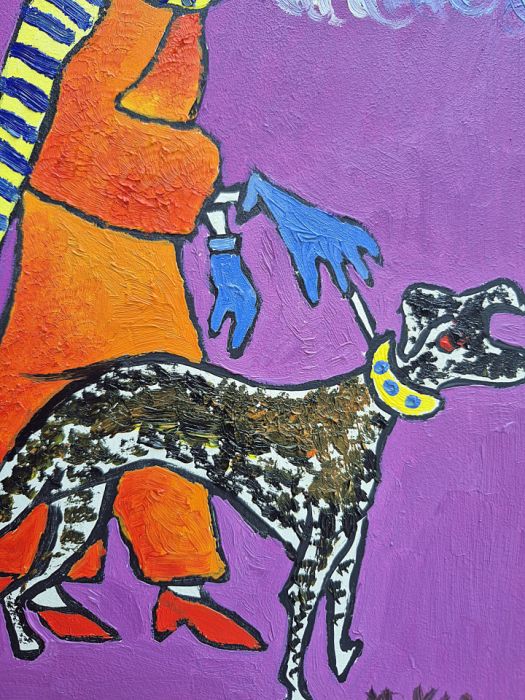 Obraz emanuje intensywną feerią barw. Tło skąpane w fioletowym odcieniu wypełnia przestrzeń, tworząc kontrast z jasnymi, niemal krzykliwymi akcentami postaci. Babcia w pomarańczowym stroju przyciąga wzrok, a jej niebieski kapelusz i szalik w paski wyglądają trochę jak z innej bajki. Kobieta trzyma psa na smyczy, który zdaje się niemal wyskakiwać z płótna, taki żywy. Farba nałożona grubo, znakomicie uchwytuje dynamikę, ruch. Wydaje mi się, że artysta bawi się techniką impasto. Sam nastrój, choć radosny, nie jest pozbawiony nutki dziwności. Pachnie jak surrealizm zmieszany z humorem. Wow, co za mix, to wygląda jak przygoda w krainie snów. Ten obraz jest tak intrygujący, że trudno przejść obok niego obojętnie. Łączy style jak sweet rhapsody, pozostawiając widza z uczuciem zaciekawienia i, hmm, być może lekkiego zakłopotania.