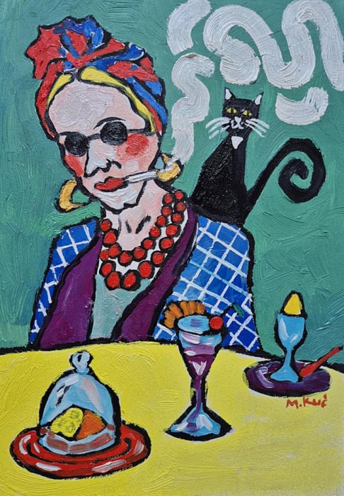 Na zielonym tle siedzi kobieta – nie portret, raczej charakter. Ma twarz zbudowaną z odważnych plam koloru, jakby emocje były ważniejsze niż anatomia. Okrągłe okulary chowają spojrzenie, ale nie tajemnicę. Usta trzymają papierosa – gest nonszalancki, trochę buntowniczy, trochę zmęczony światem. Dym układa się w miękkie, wirujące znaki, niemal jak myśli, które nie chcą zostać nazwane.