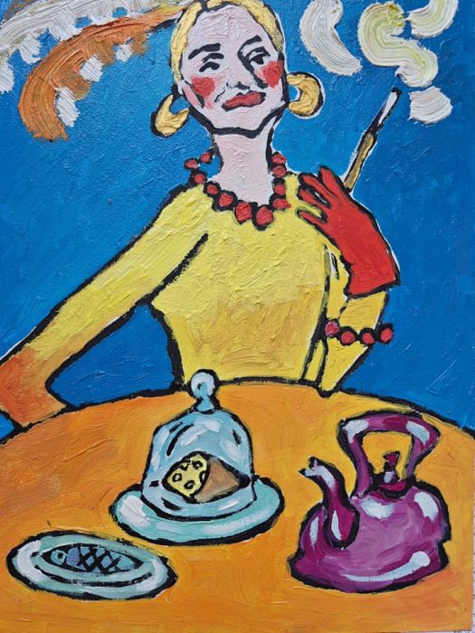 Na stole przedmioty — ryba na talerzu, kawałek sera pod kloszem, purpurowy dzbanek — nie tworzą klasycznej martwej natury. Są uproszczone, niemal dziecinne w formie, przez co zyskują charakter symboli: codzienność przedstawiona nie jako rzeczywistość, lecz jako znak. Całość balansuje między humorem a niepokojem, między lekkością a poczuciem sztuczności.