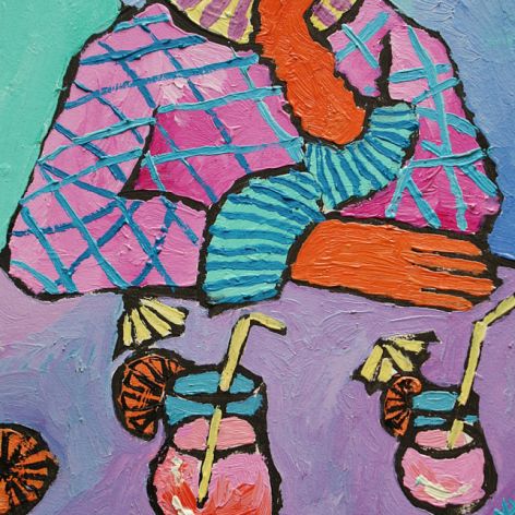 Artysta wydaje się bawić kolorem - intensywny róż, pomarańcz i błękit kontrastują ze sobą, a kompozycja jest jednocześnie uporządkowana i spontaniczna. Jakby ktoś miał na chwilę dziecku pędzel oddać. Na stole widoczne są dwa kieliszki z napojami i kawałki owoców, które dodają wakacyjnego nastroju, jakby zapraszały do chwili odprężenia. Obraz może wywoływać u odbiorcy wspomnienia z beztroskich chwil spędzonych na wakacjach. Może też wzbudzać tęsknotę za chwilą wytchnienia od codzienności.