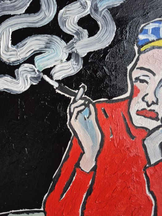 Dym z papierosa nie unosi się lekko — raczej wije się ciężko, grubą kreską, przypominając myśli, które nie potrafią znaleźć ujścia. Tworzy znaki, które niczego nie wyjaśniają, a jednak mówią wszystko. Oczy kobiety są półprzymknięte, nieobecne; patrzą gdzieś poza stół, poza chwilę.