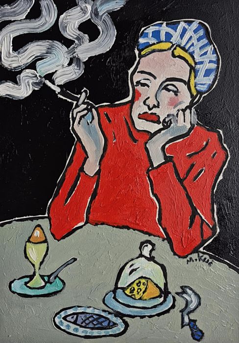 Całość przypomina sen w kawiarni, który trwa sekundę za długo. Obraz mówi o czekaniu, o samotności w miejscu publicznym, o chwili, w której czas przestaje być potrzebny. To portret ciszy — gęstej jak dym i równie trudnej do rozproszenia.