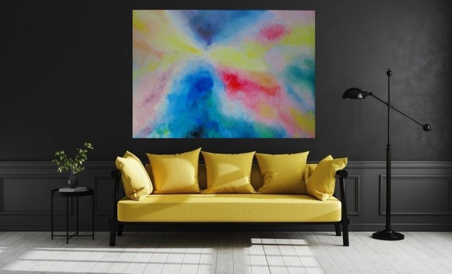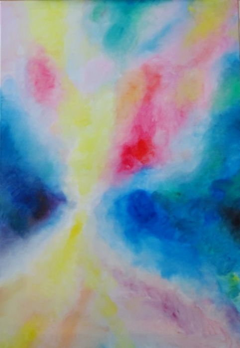 Ten obraz pulsuje jak oddech światła, jakby cała kompozycja była jednym wielkim rozbłyskiem energii rozlewającej się w różnych kierunkach. Miękkie, rozmyte przejścia barw sprawiają wrażenie, że obserwujemy narodziny czegoś ulotnego i niematerialnego — może emocji, może wspomnienia, może kosmicznego zjawiska, które dopiero nabiera kształtu.