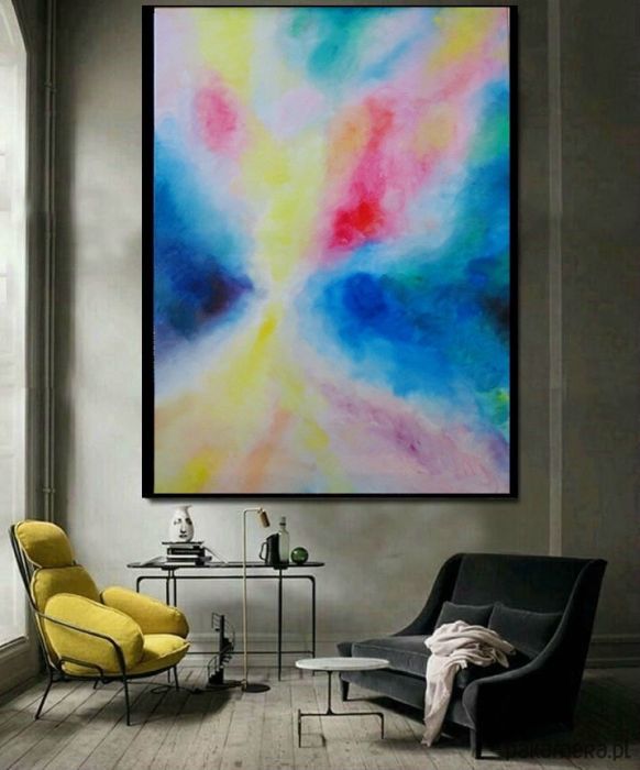Obraz namalowany techniką olejną na blejtramie o wymiarach: 100/70 cm, boki obrazu zamalowane, sygnowany z przodu. Jest to moja autorska kompozycja. Świetnie może być eksponowany w nowoczesnych wnętrzach o stonowanej kolorystyce. Swoimi barwami może rozjaśnić takie wnętrza, w oświetleniu dziennym, jak i sztucznym. Polecany dla miłośników ekspresji i nie tylko.